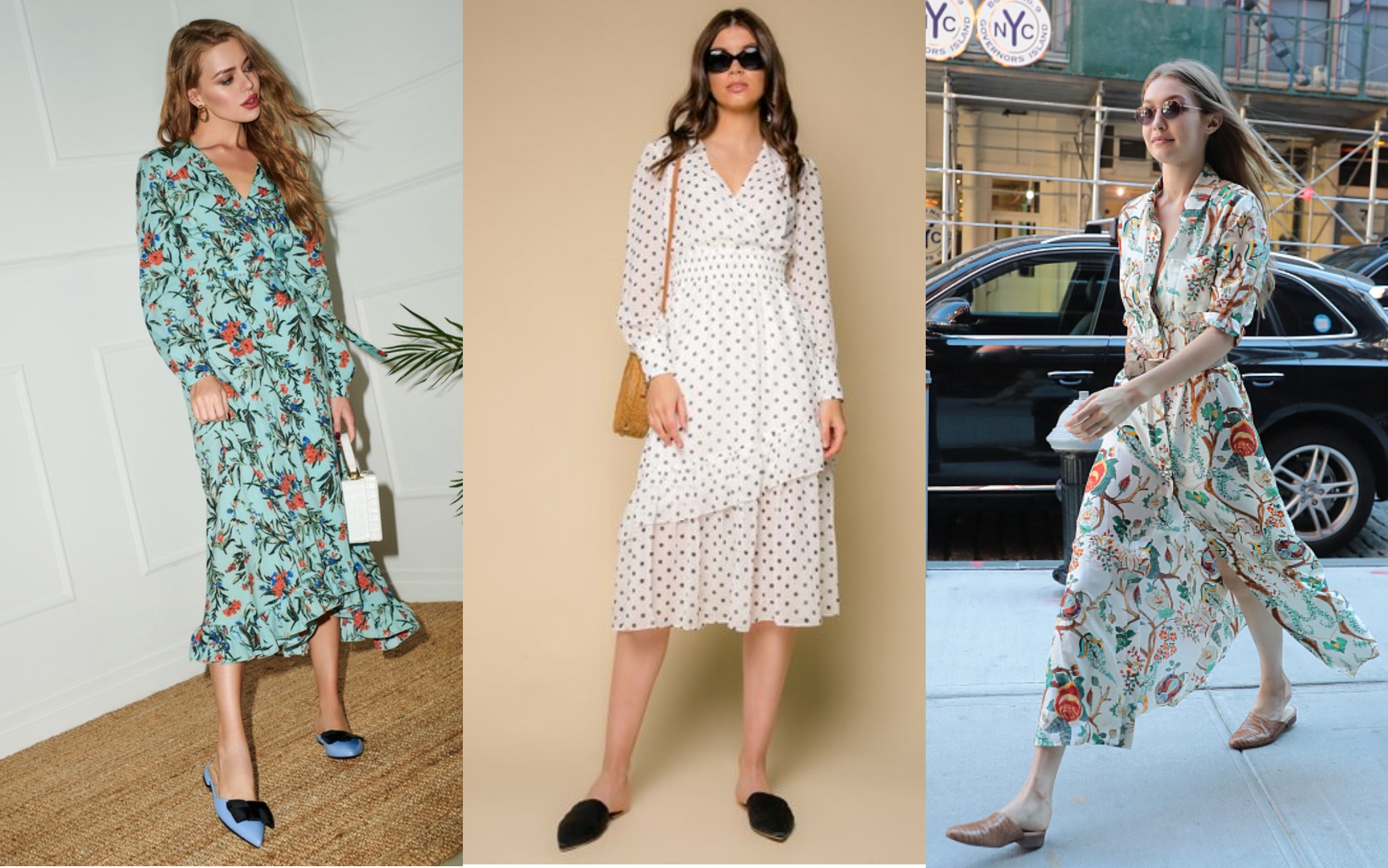 Это сочетание называют базой повседневной одежды для лета. Выбирайте, что душе угодно - миди с плиссировкой, джинсовые или кружевные сарафаны, флористичные платья с воланами. Для самых смелых женщин дизайнеры предлагают бельевые наряды вроде «комбинаций», которые оказались важной частью городского гардероба. Их часто украшают тесёмками, лентами или оставляют без декора.