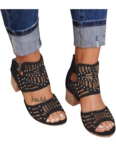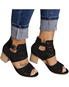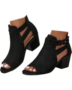 Женские босоножки с открытым носком, летние, с вырезами по бокам, ремешком, молнией, массивным каблуком, без задника, на каблуке до щиколотки, Black