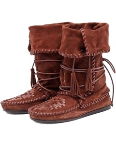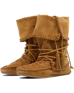 Женские сапоги Suede с отворотом - мягкие ботильоны в стиле бохо до середины голени с плетеными бахромами, вестерн-ковбойские сапоги на широкую икру, удобные плоские ботинки с шнуровкой и ретро-кисточ