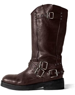 Женские сапоги до середины голени с широким низким каблуком, пряжкой, квадратным носком, мотоциклетные сапоги на молнии, ботильоны для езды на байке, Coffee Brown