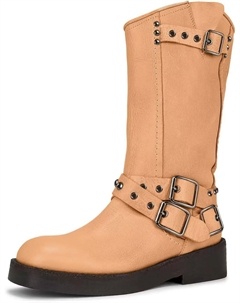 Женские сапоги до середины голени с широким низким каблуком, пряжкой, квадратным носком, мотоциклетные сапоги на молнии, ботильоны для езды на байке, Nude