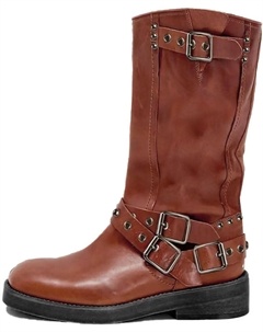 Женские сапоги до середины голени с широким низким каблуком, пряжкой, квадратным носком, мотоциклетные сапоги на молнии, ботильоны для езды на байке, Tan