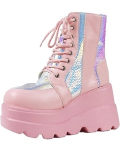 Женские ботинки на платформе, с квадратным носком, шнуровкой и молнией, высокие каблуки, боевые ботильоны на танкетке, 1Pink
