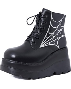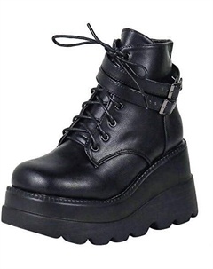 Женские ботинки на платформе, с квадратным носком, шнуровкой и молнией, высокие каблуки, боевые ботильоны на танкетке, Q-Black