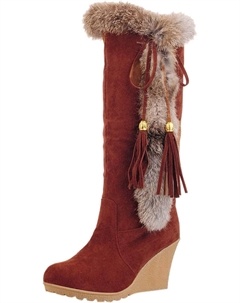 Женские зимние теплые длинные ботинки на высоком каблуке, модные ботильоны на танкетке с искусственным мехом, удобные высокие пушистые ботфорты, Brown