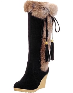 Женские зимние теплые длинные ботинки на высоком каблуке, модные ботильоны на танкетке с искусственным мехом, удобные высокие пушистые ботфорты, Black