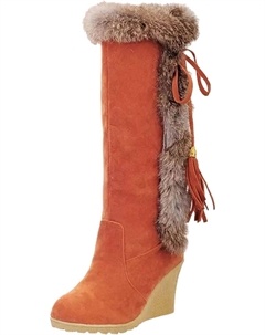 Женские зимние теплые длинные ботинки на высоком каблуке, модные ботильоны на танкетке с искусственным мехом, удобные высокие пушистые ботфорты, Orange
