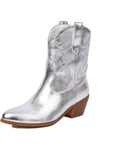 Женские вышитые ковбойские ботинки в западном стиле на толстом каблуке, ботильоны на каждый день, для свиданий и вечеринок, Silver