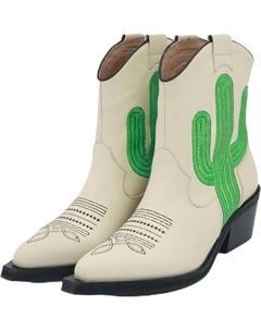 Женские ковбойские ботинки с вышивкой кактусов, ковбойские ботильоны с заостренным носком, короткие вестерн-ботинки на низком массивном каблуке, White