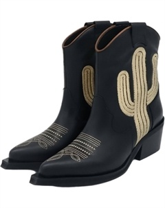 Женские ковбойские ботинки с вышивкой кактусов, ковбойские ботильоны с заостренным носком, короткие вестерн-ботинки на низком массивном каблуке, Black