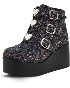 Женские ботильоны на платформе с массивным каблуком - круглый носок, молния, танкетка, высокий каблук, рэйв-застежка с пряжкой, толстая подошва, готические ботиночки, Black Glitter