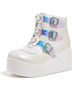 Женские ботильоны на платформе с массивным каблуком - круглый носок, молния, танкетка, высокий каблук, рэйв-застежка с пряжкой, толстая подошва, готические ботиночки, White Hologram