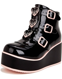 Женские ботильоны на платформе с массивным каблуком - круглый носок, молния, танкетка, высокий каблук, рэйв-застежка с пряжкой, толстая подошва, готические ботиночки, Black/Pink