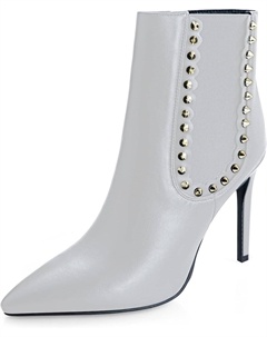 Женские модные ботильоны с острым носком, шпилькой, из искусственной кожи с заклепками, удобным высоким каблуком, боковой эластичной молнией и платьевым стилем, White Matte