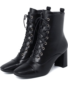 Женские ботильоны на шнуровке с массивным каблуком, квадратным носком, высоком толстом каблуке, ботинки в стиле «комбат» с молнией, короткие ботильоны, Y-Black