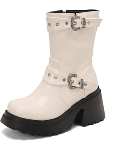 Женские ботильоны Platform на платформе, с молнией, круглый носок, байкерские ботинки с пряжкой, мотоботинки, White Fleece-Lined
