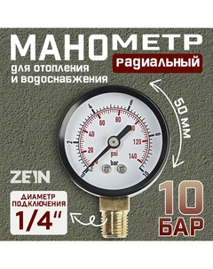 Манометр, радиальный, диаметр корпуса 50 мм, 10 бар, 1/4