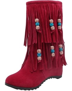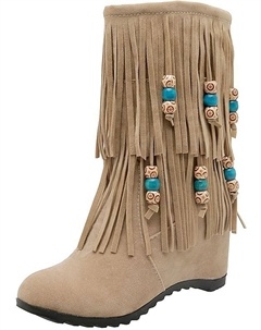 Женские ботильоны до середины голени с бахромой на скрытой танкетке, винтажные с бусинами и кисточками, с круглым носком, поддержкой свода стопы, ковбойские платформенные зимние теплые снежные ботинки