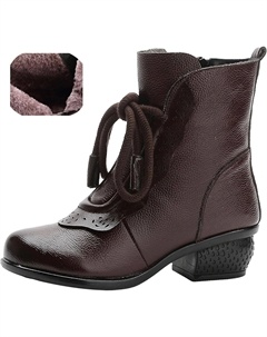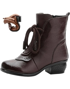 Женские винтажные кожаные ботильоны, осень-зима, удобные, с круглым носком, массивным низким каблуком, мягкой подошвой, молнией, короткие праздничные ботинки, Brown+Velvet