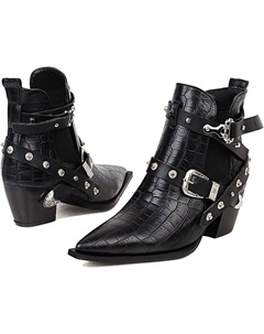 Женские ковбойские ботильоны с заостренным носком, на толстом каблуке, из кожи, в западном стиле, с заклепками и пряжкой, большого размера до 15, Black