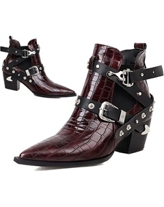 Женские ковбойские ботильоны с заостренным носком, на толстом каблуке, из кожи, в западном стиле, с заклепками и пряжкой, большого размера до 15, Claret