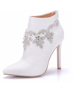 Женские свадебные ботильоны на шпильке с заостренным носком, удобные, с противоскользящей подошвой, задней молнией, блестящие со стразами, модные короткие ботинки, White